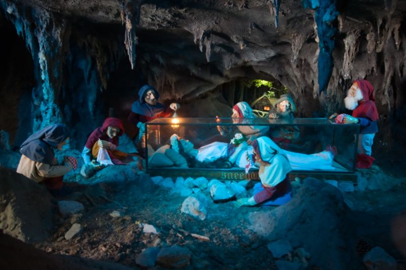 De grot met daarin Sneeuwwitje en de Zeven Dwergen heeft al vanaf 1952 een plaatsje in het Sprookjesbos. In 1999 werd het kasteel erbij gebouwd, waar de toverspiegel van de boze stiefmoeder hangt.